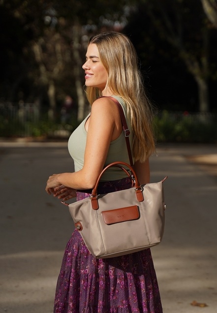 Bolso góndola de asa extensible va cerrado con cremallera metálica dorada, con bolsillo en la parte frontal. Fabricado en piel vacuno de tacto suave en color beige combinado con piel vacuno de color cuero . Los herrajes son dorados. El interior tiene forro textil de poliéster con bolsillo de cremallera y bolsillo para el móvil. Fabricado en España en...