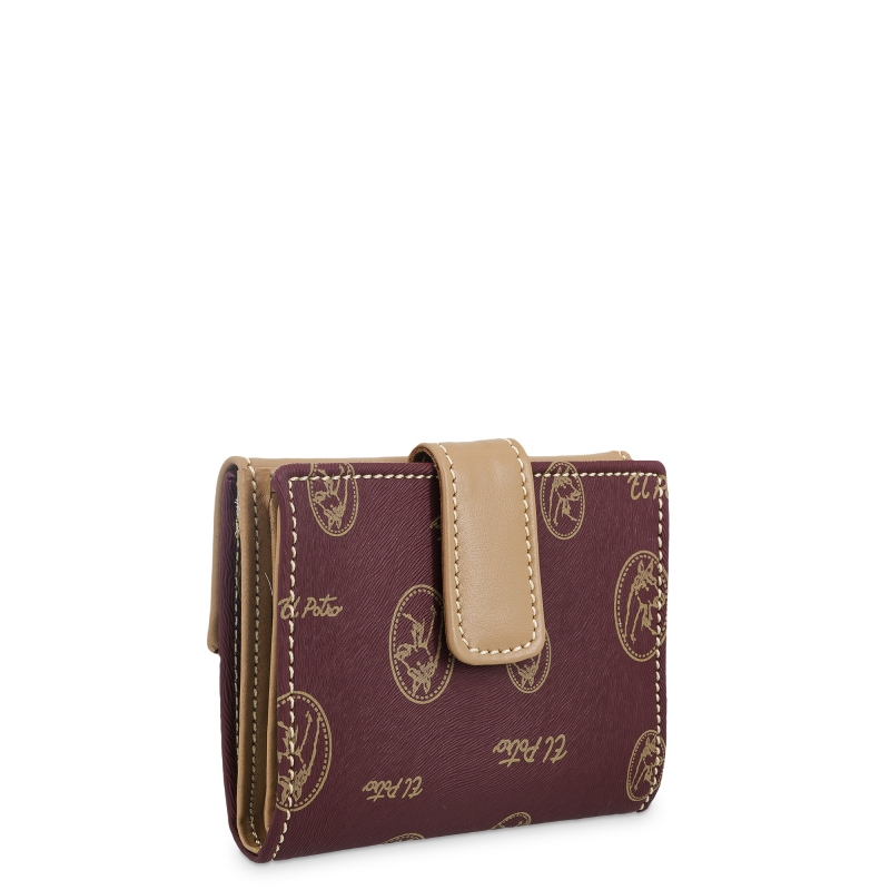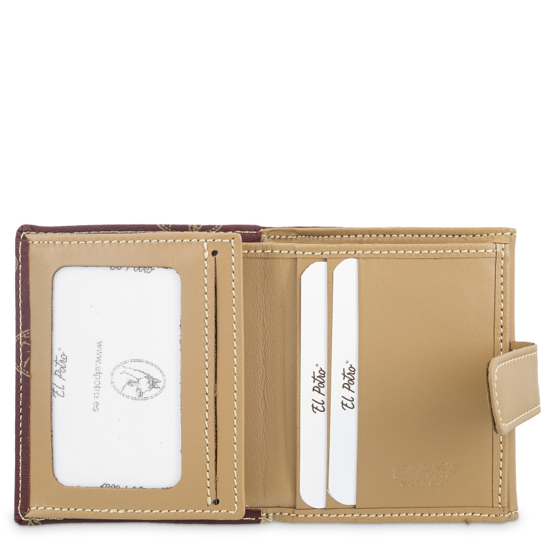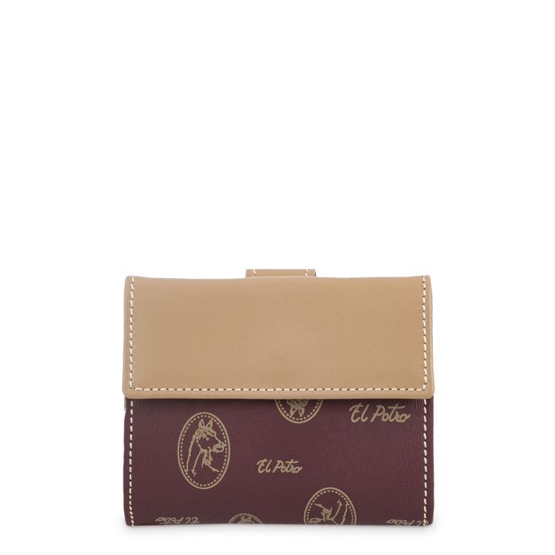 Cartera pequeña EL POTRO perteneciente a la colección Vintage, fabricada en UBRIQUE en lona y piel vacuno color burdeos y cierre de broche. De construcción semirigida y medidas aproximadas de: 9 x 7 x 2 cm. Dispone de bolsillos interiores. Bolsillos exteriores. Herrajes color Dorado. Presentado en caja de cartón.